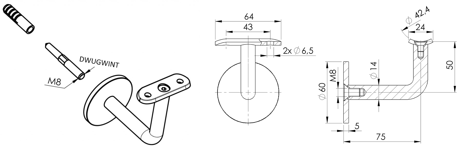 • Mocowanie podpory poręczy: na śrubę dwugwintową lub pręt gwintowany M8 na kotwie chemicznej