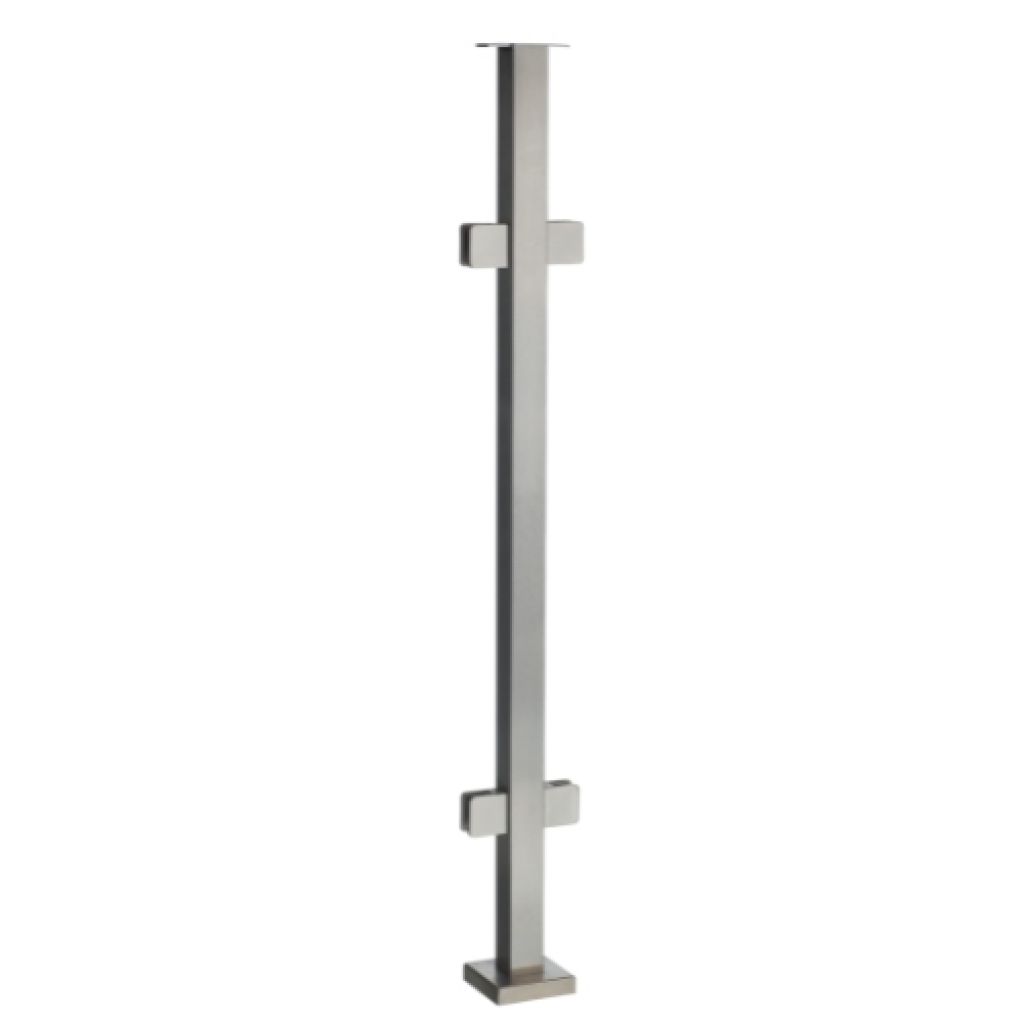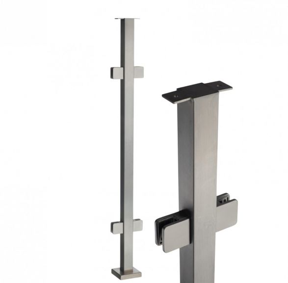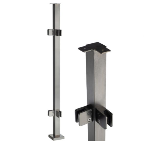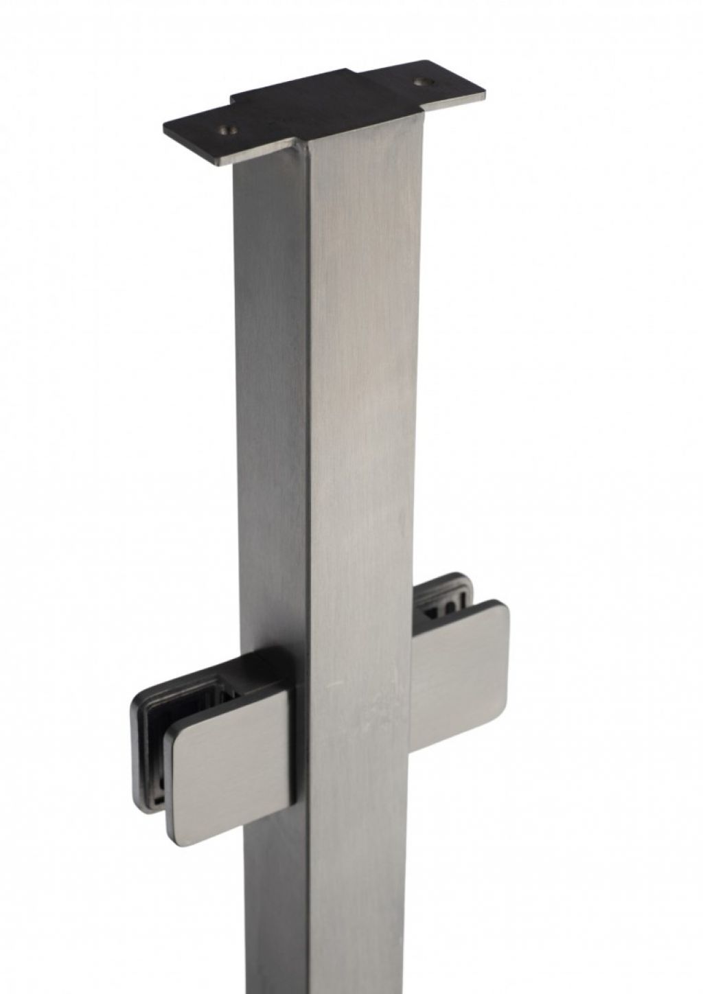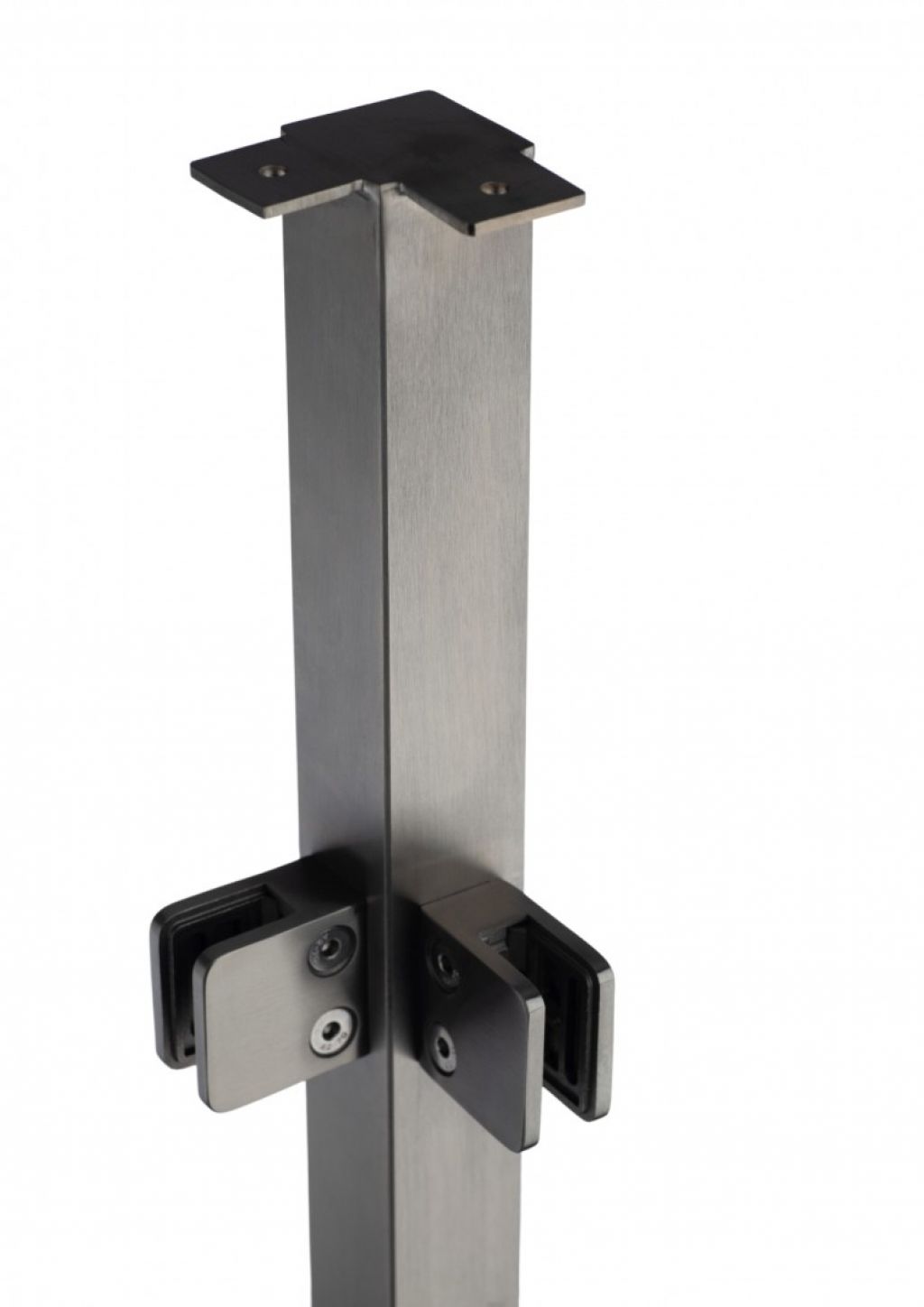 Słupek systemowy z blaszkami do zamocowania poręczy z profilu lub drewnianej z uchwytami zaciskowymi do zamocowania szkła