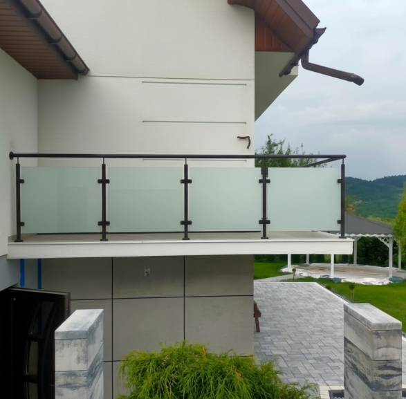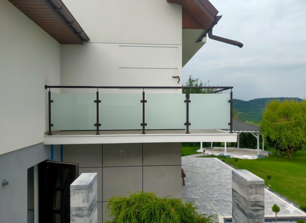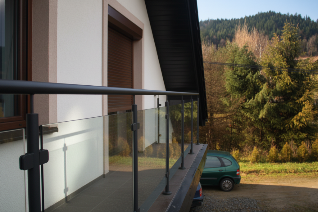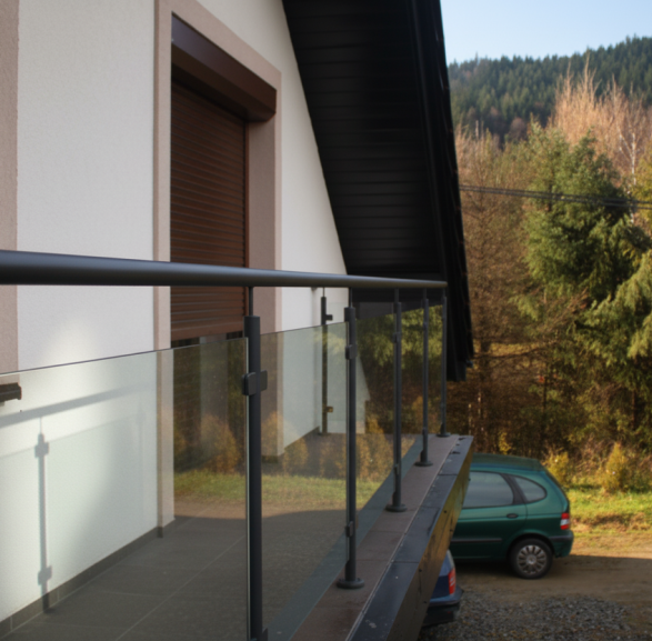 • Nowoczesny wygląd: połączenie słupków z poręczą i szkła nadaje balustradzie elegancję, nowoczesność oraz prezentuje się bardzo estetycznie. Poręcz górna stanowi wykończenie całej balustrady.
