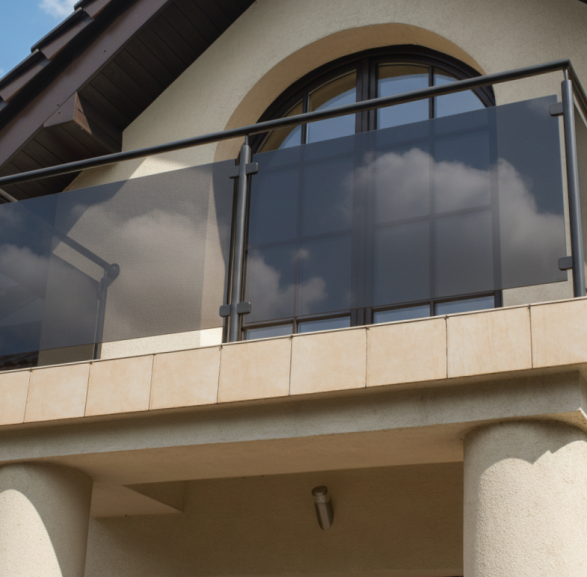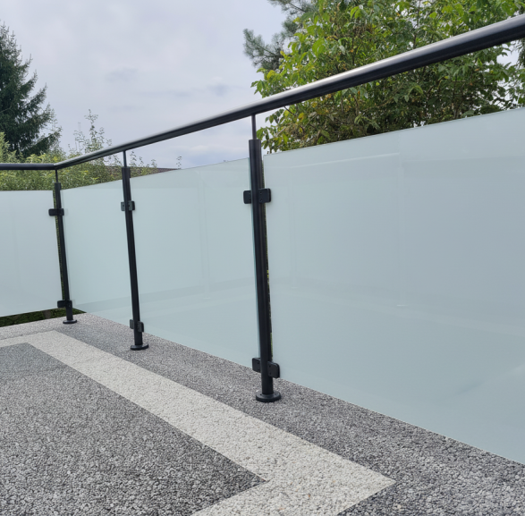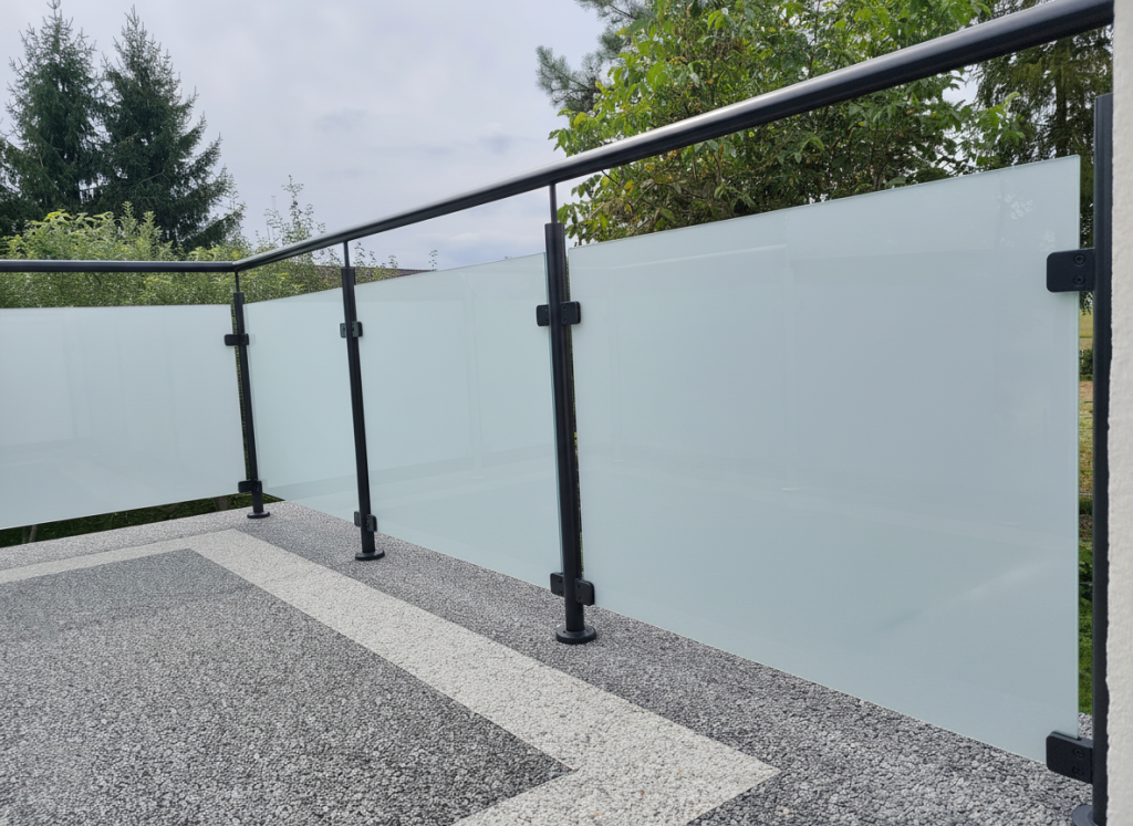 balustrada szklana balkonowa na słupkach z poręczą antracyt ral 7016 szkło mleczne