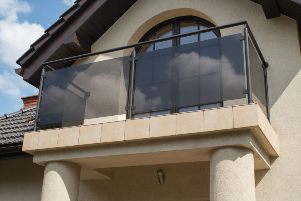 Balustrada szklana balkonowa na słupkach z poręczą antracyt RAL 7016 szkło grafitowe
