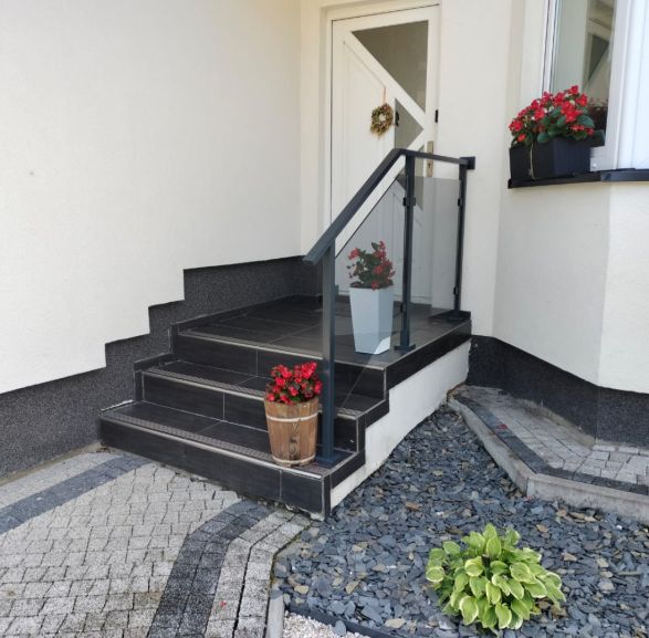 • Nowoczesny wygląd: połączenie słupków z poręczą i szkła nadaje balustradzie elegancję, nowoczesność oraz prezentuje się bardzo estetycznie. Poręcz górna stanowi wykończenie całej balustrady.