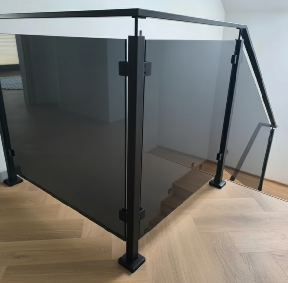 balustrada schodowa szklana na słupkach z poręczą loft szkło grafitowe