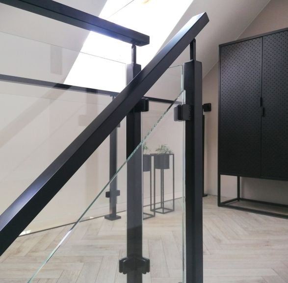 Balustrada schodowa szklana na słupkach z poręczą czarny RAL 9005 loft szkło bezbarwne