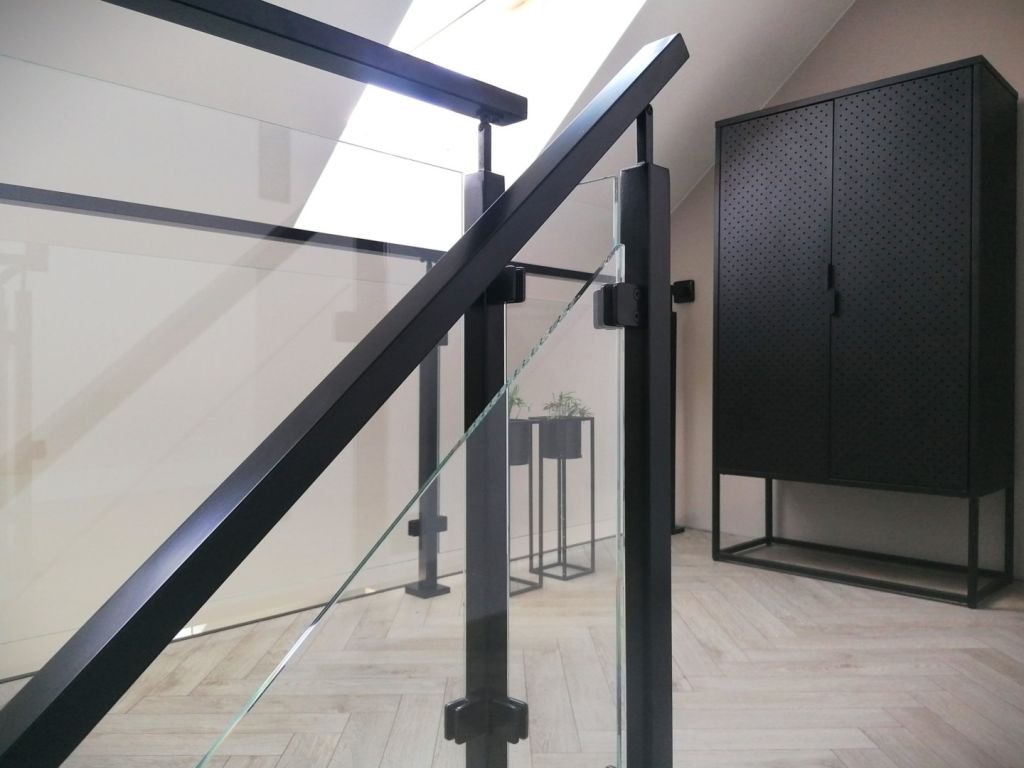 Balustrada szklana na słupkach 40x40 z poręczą w stylu loft czarny ral 9005 to uniwersalne rozwiązanie, które sprawdzi się w wielu przestrzeniach: