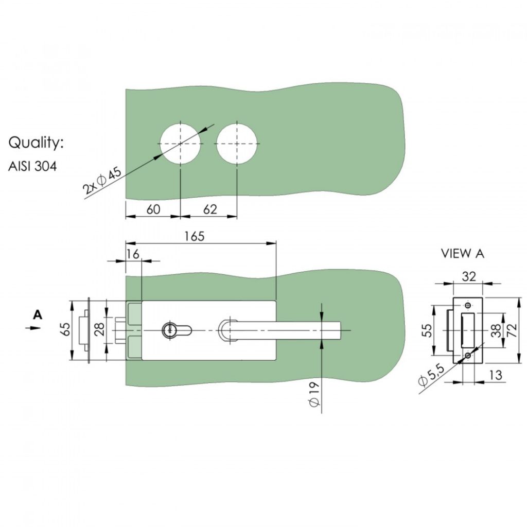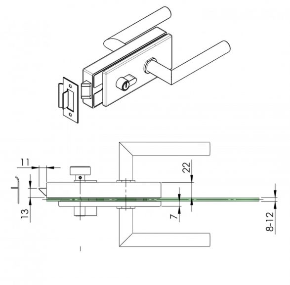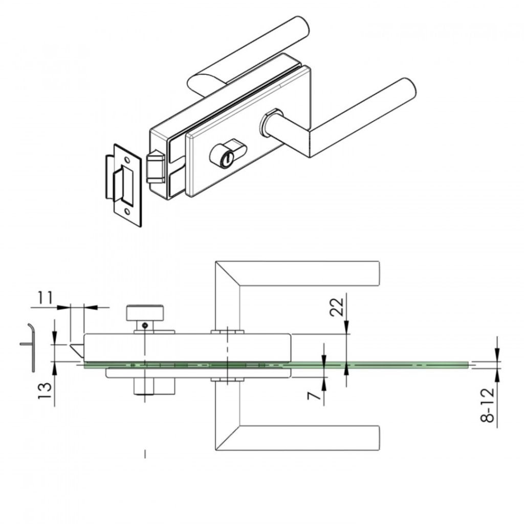 • Zamek z wkładką cylindryczną dla grubości szkła 8, 10, 12 mm.